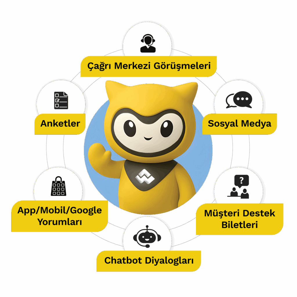 Anketler, çağrı merkezi kayıtları, yazılı geri bildirimler, dijital kanallar ve operasyonel sistemlerden gelen müşteri geri bildirimleri, tek bir CX içgörü katmanı altında birleştirilir.